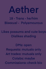 -If the buyer breaks any of the points stated above they will lose all the beforementioned rights to the artwork commissioned by me, Aether (the artist), and I will have the right to profit further from the commissioned artwork in any way I see fit. If you have a problem with any of these statements, they may be changed if discussed with me prior to paying your commissioned piece.What do you get?-Drafts/mockups that you must decide which one I should continue with (depending on the complexity of the commission there might be fewer or more drafts)